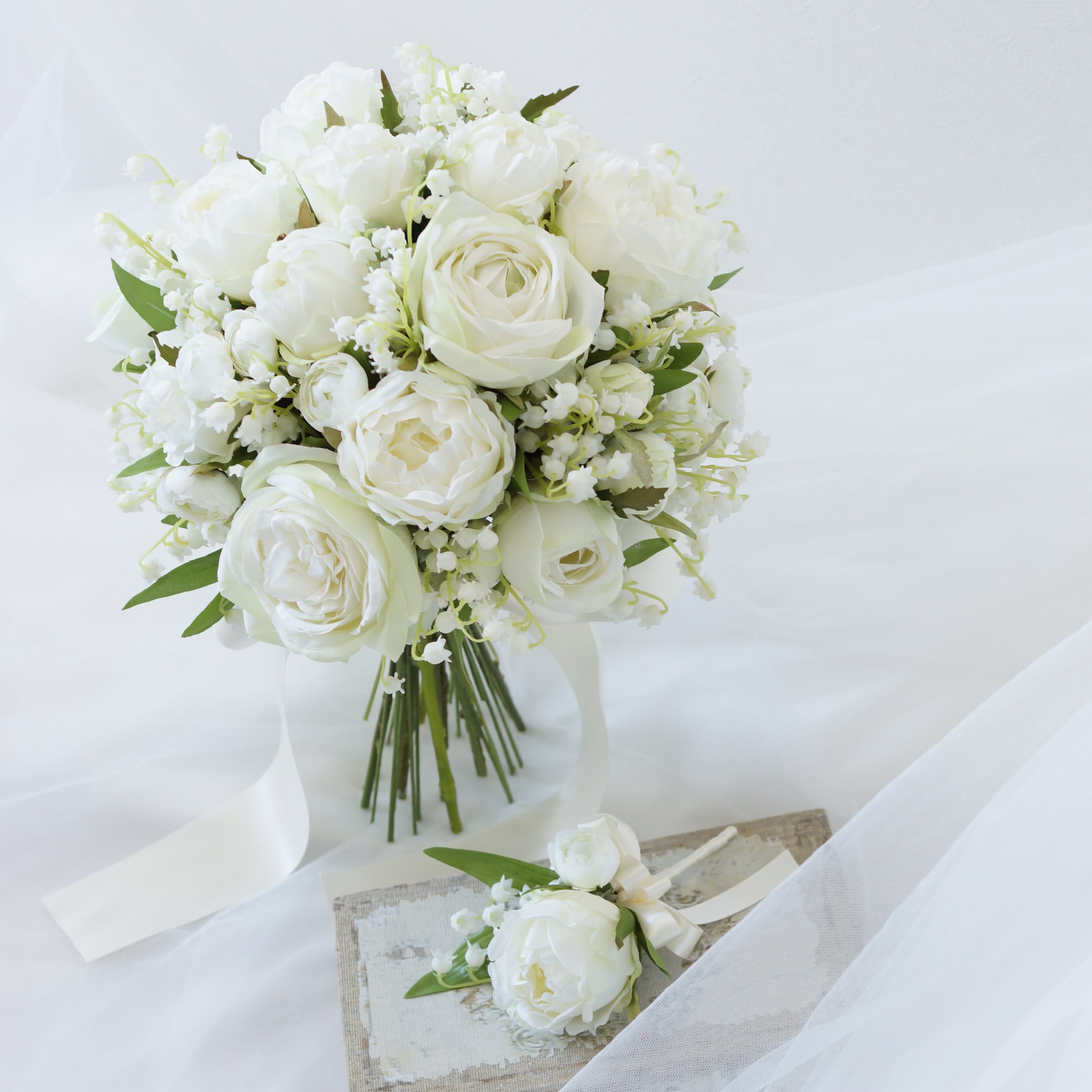 清楚なスズランとカップ咲きバラのウェディングブーケ・ブートニアセット